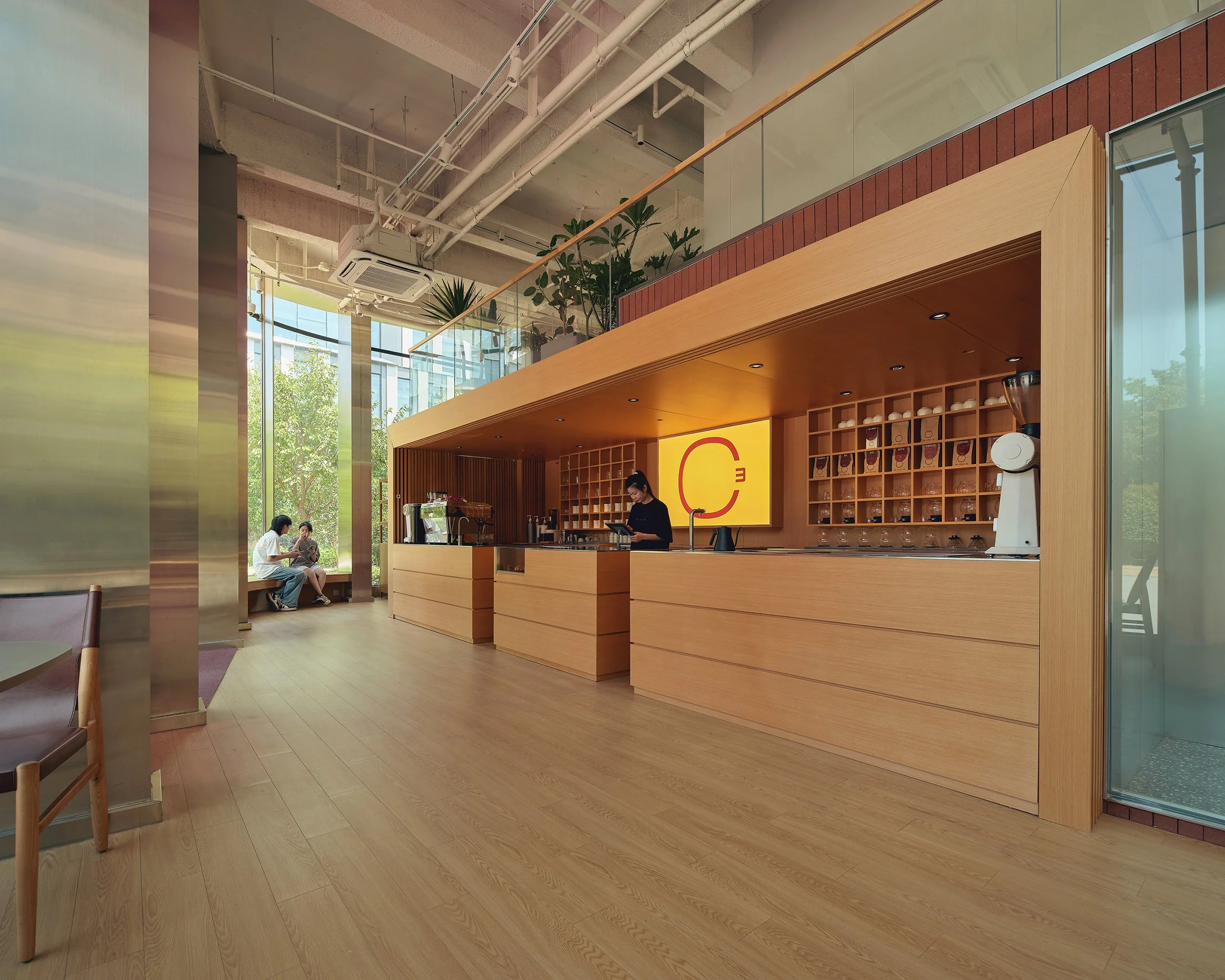 Located in a newly developed office park in Songjiang District, Shanghai, the café is situated at the center of a standalone glass building, surrounded by office buildings. Lin Yuhsien Design Studio skillfully utilizes the advantage of the glass building's four-sided, unobstructed lighting to boldly create another architectural space within the glass structure, forming a unique "building within a building" experience. Guests can freely explore this space and appreciate the unique interior architecture as if they are in a modern sanctuary.